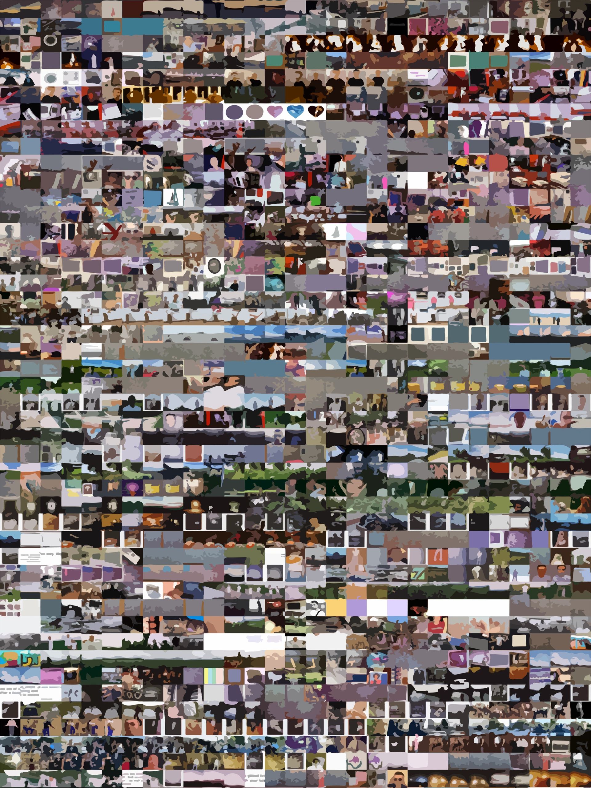 Through the use of large-scale prints, text-based banners, and sculptures, the exhibition opens a discussion of how overconsumption of media skews our perception of reality.